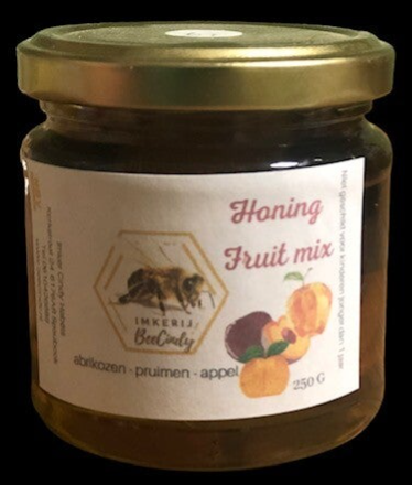 Honing met toegevoegde stukken fruit van appel, abrikoos en pruimen